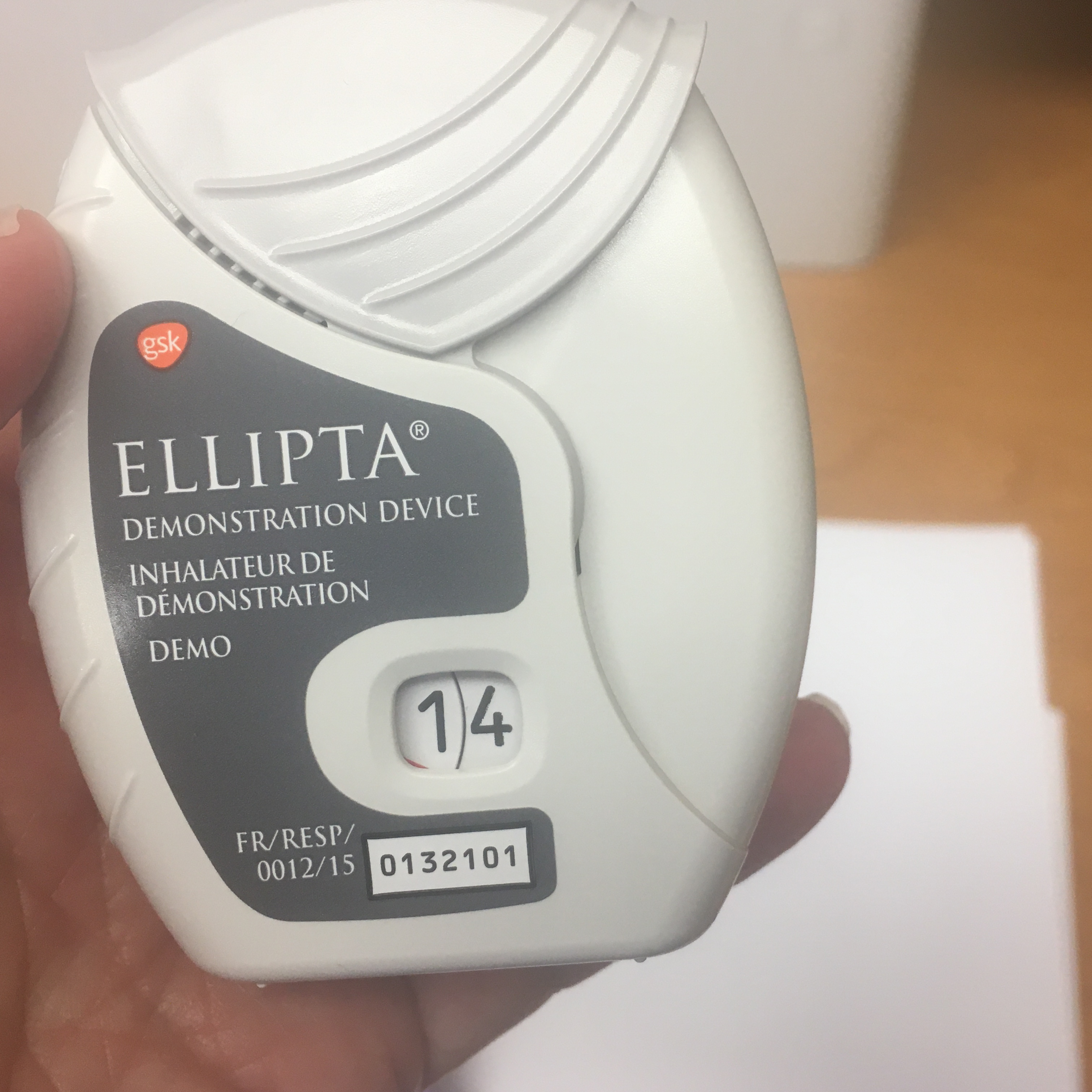 For the Ellipta inhaler, the left half of the dose window will turn red with 10 doses left. After the last dose is inhaled, the counter will show a full red background.